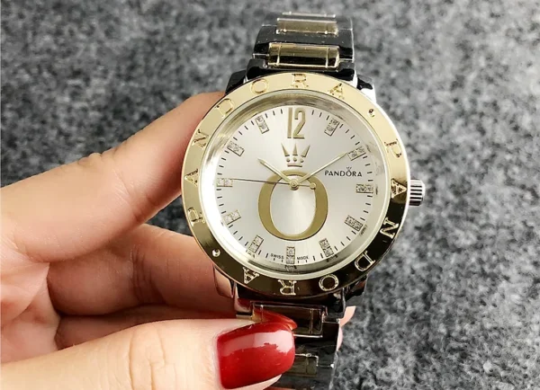 Γυναικείο ρολόι PANDORA πολυτελείας με gold μπρασελέ και καντράν!  Διάμετρος καντράν 4,2 εκατοστά!! Κατασκευασμένο εξ ολοκλήρου από ανοξείδωτο ατσάλι, είναι αδιάβροχο μέχρι 3 Atm (πλύσιμο χεριών).  Διάμετρος καντράν 4,2 εκατοστά με ορυκτό κρύσταλλο!! Συνοδεύεται από 2 υπέροχα βραχιόλια open Size. Κατασκευασμένα από ανοξείδωτο ατσάλι, με διπλή επιμετάλλωση κίτρινου χρυσού. Αντιαλλεργικό, σύμφωνα με τις απαιτήσεις της Ευρωπαϊκής Ένωσης! Τα βραχιόλια προσαρμόζονται σε όλα τα μεγέθη καρπών.