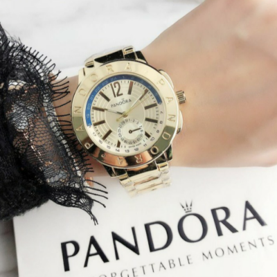Γυναικείο ρολόι PANDORA πολυτελείας με gold μπρασελέ και καντράν! Κατασκευασμένο εξ ολοκλήρου από ανοξείδωτο ατσάλι, είναι αδιάβροχο μέχρι 3 Atm (πλύσιμο χεριών). Διάμετρος καντράν 4,2 εκατοστά με ορυκτό κρύσταλλο!! Συνοδεύεται από 4 υπέροχα βραχιόλια open Size κατασκευασμένα από ανοξείδωτο ατσάλι.