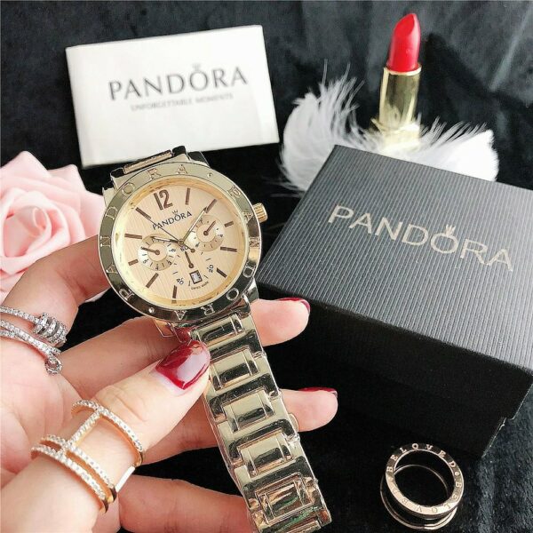 Γυναικείο ρολόι PANDORA πολυτελείας με gold μπρασελέ και καντράν! Κατασκευασμένο εξ ολοκλήρου από ανοξείδωτο ατσάλι, είναι αδιάβροχο μέχρι 3 Atm (πλύσιμο χεριών).  Διάμετρος καντράν 4,2 εκατοστά με ορυκτό κρύσταλλο!! Συνοδεύεται από 4 υπέροχα βραχιόλια open Size κατασκευασμένα από ανοξείδωτο ατσάλι.