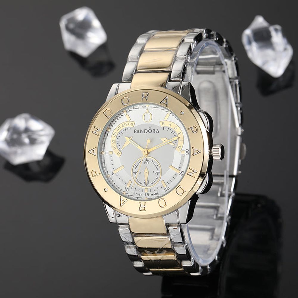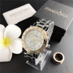 Γυναικείο ρολόι PANDORA πολυτελείας με Silver-gold μπρασελέ και καντράν! Κατασκευασμένο εξ ολοκλήρου από ανοξείδωτο ατσάλι, είναι αδιάβροχο μέχρι 3 Atm (πλύσιμο χεριών).  Διάμετρος καντράν 4,2 εκατοστά με ορυκτό κρύσταλλο!! Συνοδεύεται από 5 υπέροχα βραχιόλια βέργες κατασκευασμένα από ανοξείδωτο ατσάλι.