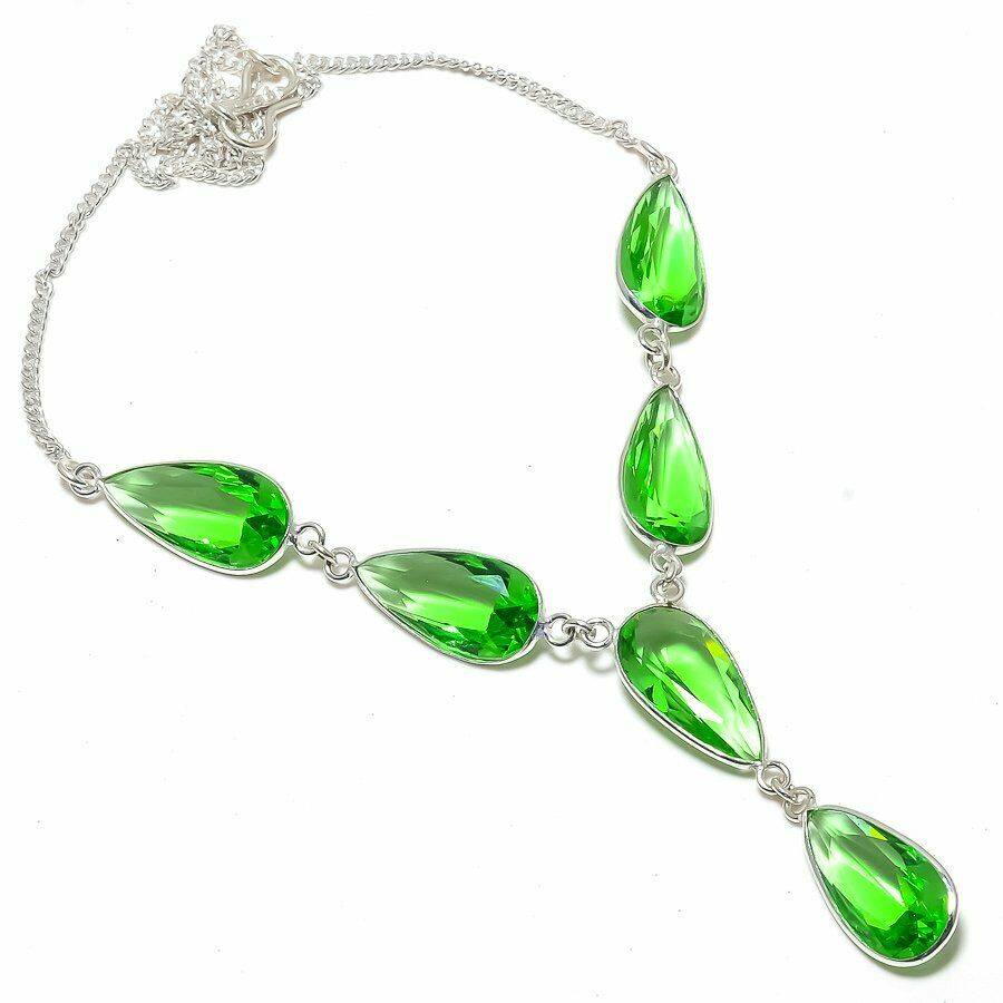Ένα καταπληκτικό κολιέ, χειροποίητο ινδικό. Κατασκευασμένο από ασήμι 925 μήκους, 45 εκατοστών. Διακοσμημένο με ορυκτές, πολύτιμες, πράσινες πέτρες τσαβορίτη σε κοπή pear . Total Carat Weight (TCW): 120 CTS!