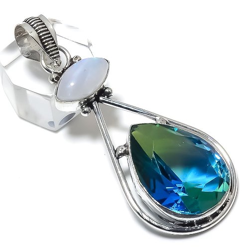 Χειροποίητo ινδικό μενταγιόν. Κατασκευασμένο από ασήμι 925. Διακοσμημένο στο κέντρο με πέτρα πολύχρωμης τουρμαλίνης (Multi Color Tourmaline) (lab creation) σε κοπή pear και μικρότερη πέτρα φεγγαρόπετρας (lab-creation).