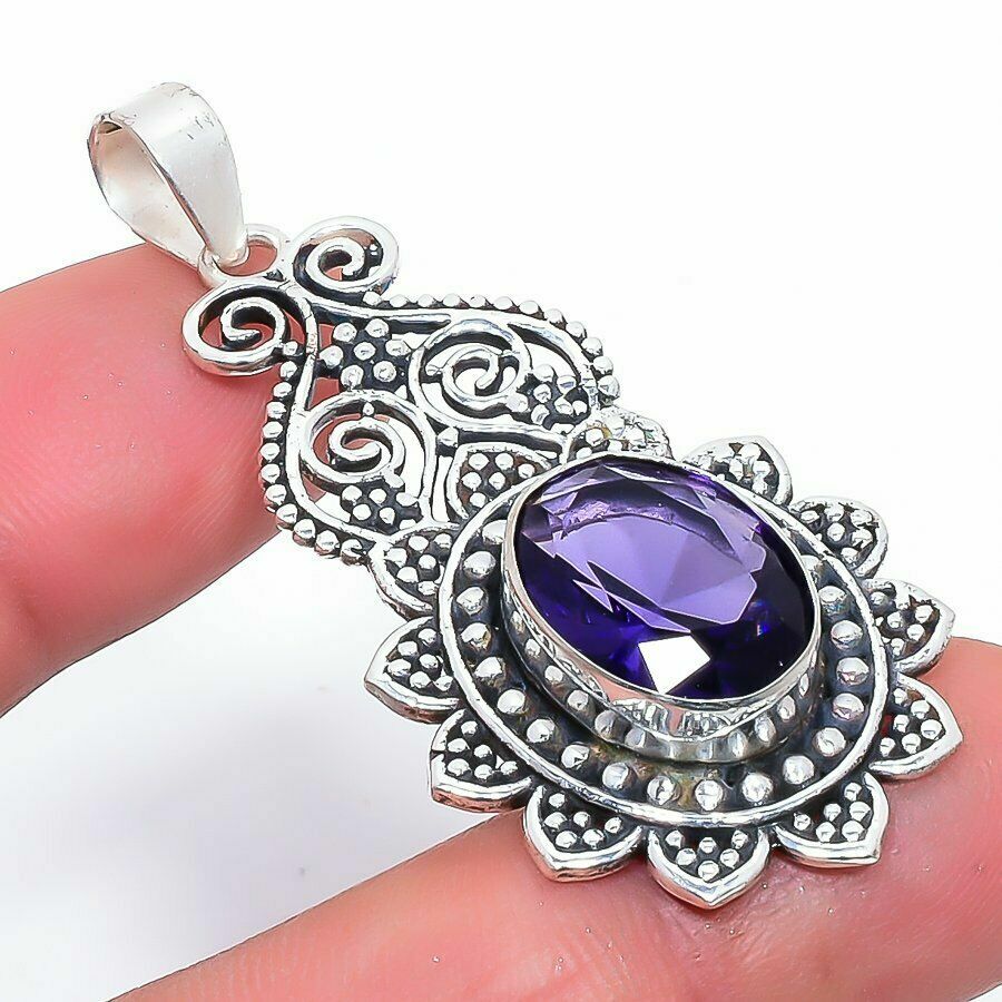 Ινδικό, χειροποίητο, μεγάλο μενταγιόν 5,58 εκατοστά, απαράμιλλης ομορφιάς και ποιότητας, κατασκευασμένο από μασίφ ασήμι 925 διακοσμημένο με ορυκτό αμέθυστο σε κοπή οβάλ!
