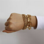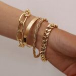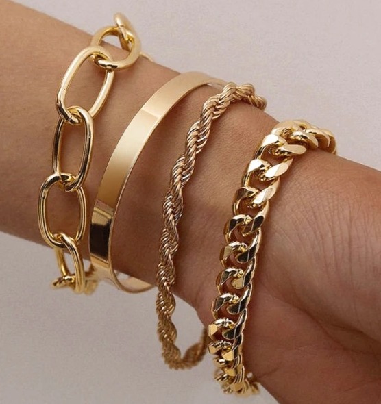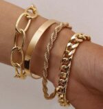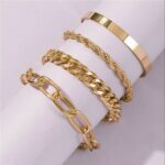 Γυναικείο μοντέρνο σετ που αποτελείται από τέσσερα βραχιόλια! Κατασκευασμένα από ατσάλι με διπλή επιμετάλλωση κίτρινου χρυσού. Τα τέσσερα βραχιόλια διαθέτουν αλυσιδάκι προέκτασης έτσι ώστε να αυξομειώνεται το μήκος και να προσαρμόζεται σε όλους τους καρπούς.