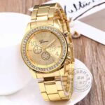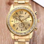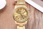 Γυναικείο αναλογικό ρολόι Geneva, σε χρώμα gold! Το καντράν του περιμετρικά είναι διακοσμημένο με λευκά ζιργκόν σε κοπή round! Διάμετρος καντράν 4 εκατοστά! Μήκος μπρασελέ περίπου 24cm, πλάτος μπρασελέ 1,8cm! Διαθέτει μεταλλικό μπρασελέ από ανοξείδωτο ατσάλι, με κούμπωμα ασφαλείας. Κρύσταλλο ορυκτό ειδικής σκλήρυνσης.