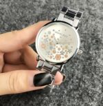 Μοναδικής ομορφιάς αναλογικό ρολόι πολυτελείας Michael Kors σε silver χρώμα! Η κάσα του διακοσμείται εσωτερικά με πολύχρωμες μαργαρίτες καθώς και με αυστραλιανά κρύσταλλα που προσδίδουν ξεχωριστή ομορφιά και φινέτσα στο ρολόι! Διάσταση καντράν 3,8 εκατοστά! Η κάσα του και το μπρασελέ του είναι από ανοξείδωτο ατσάλι!