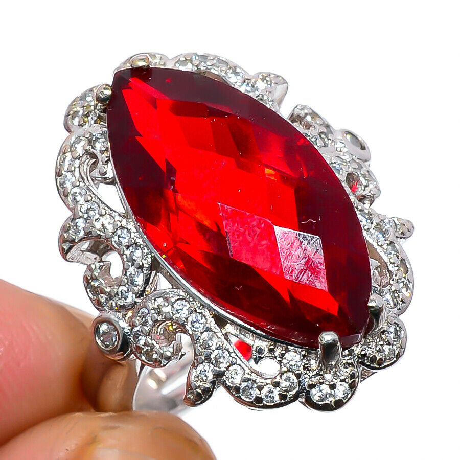 Ένα εξαιρετικής ποιότητας χειροποίητο ινδικό δαχτυλίδι, κατασκευασμένο από ασήμι 925! Διακοσμημένο με πέτρα λυχνίτη (Garnet) (lab creation) σε κοπή oval και περιμετρικά με μικρότερες πέτρες λευκού τοπάζ (lab creation). Ένα Open Size δαχτυλίδι!