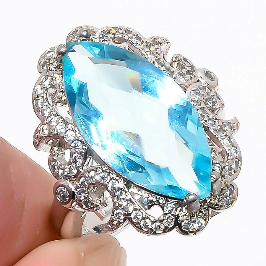 Χειροποίητο ινδικό δαχτυλίδι, κατασκευασμένο από ασήμι 925. Διακοσμημένο με πέτρα Ελβετικού μπλε τοπάζιου (Swiss Blue Topaz) (lab creation) σε κοπή oval και περιμετρικά με μικρότερες πολύτιμες πέτρες λευκού τοπάζ (lab creation). Ένα Open Size δαχτυλίδι!