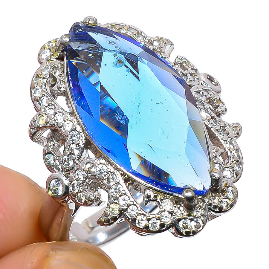 Ένα εξαιρετικής ποιότητας χειροποίητο ινδικό δαχτυλίδι, κατασκευασμένο από ασήμι 925! Διακοσμημένο με πέτρα τανζανίτη χαλαζία (Tanzanite Quartz) (lab creation) σε κοπή oval και περιμετρικά με μικρότερες πέτρες λευκού τοπάζ (lab creation). Ένα Open Size δαχτυλίδι!