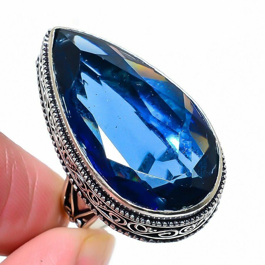 Για τις κυρίες που τους αρέσουν τα μεγάλα δαχτυλίδια με όγκο, 3,7×2,3cm. Χειροποίητο, κατασκευασμένο από ασήμι 925 διακοσμημένο με μπλε ζαφείρι (Lab-Created) σε κοπή pear. Περιμετρικά σκαλιστή χειροποίητη δαντέλα. Το δαχτυλίδι είναι διαθέσιμο στο νούμερο 18 ή αλλιώς 58.