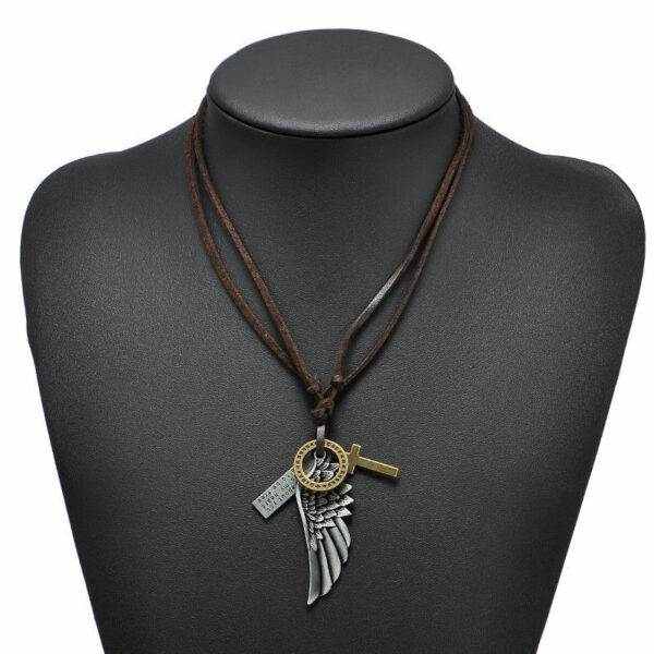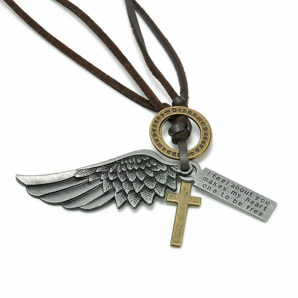 Ανδρικό κολιέ “I feel about you makes my heart one to be free” με τα φτερά του Αγγέλου και το αιώνιο σύμβολο του σταυρού δεμένα με δερμάτινο κορδόνι. Kατασκευασμένο από ατσάλι έτσι ώστε να μένει αμετάβλητο στο χρόνο..