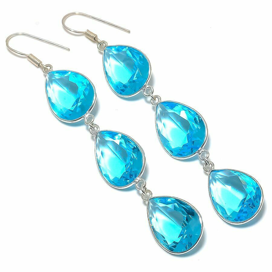 Xειροποίητα ινδικά σκουλαρίκια κατασκευασμένα από ασήμι 925 και διακοσμημένα με 100% φυσικό ορυκτό μπλέ τοπάζι  (Swiss Blue Topaz) σε κοπή pear. Total Carat Weight (TCW): 60ct.  Τα σκουλαρίκια έχουν μήκος 7.89 εκατοστά.
