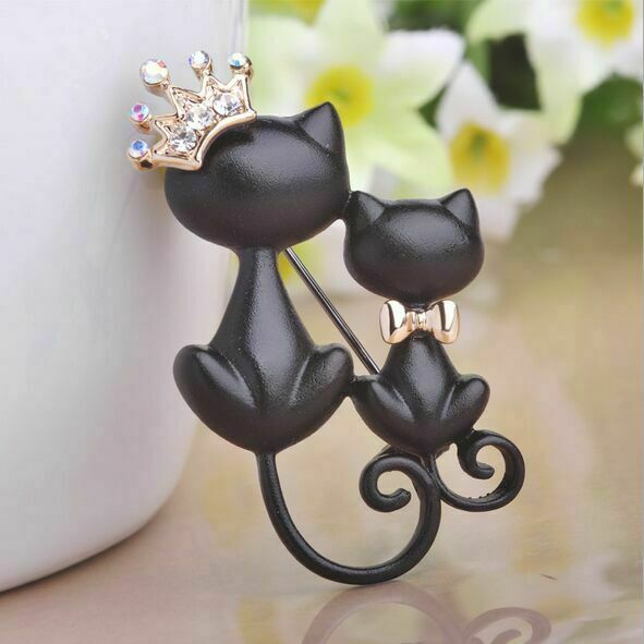 καρφίτσα σε silver black χρώμα και χρυσές λεπτομέρειες με ζιργκόν σε κοπή round, υψηλής καθαρότητας και λάμψης,μοτίφ δύο αριστοκρατικές γάτες!