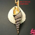 Υπέροχο μενταγιόν με μοτίφ ένα Κοχύλι, διακοσμημένο με λευκά ζιργκόν και μαύρο σμάλτο. Κατασκευασμένο από ασήμι και χαλκό. Συνοδεύεται από επίχρυση αλυσίδα 75 εκατοστών. Φιλοτεχνημένο από τη γνωστή σχεδιάστρια κοσμημάτων Βetsey Johnson.