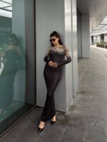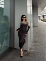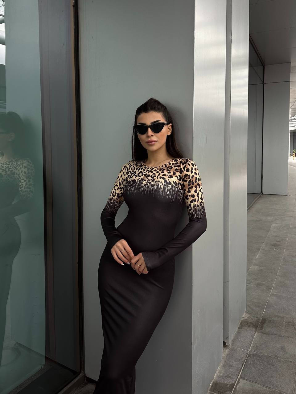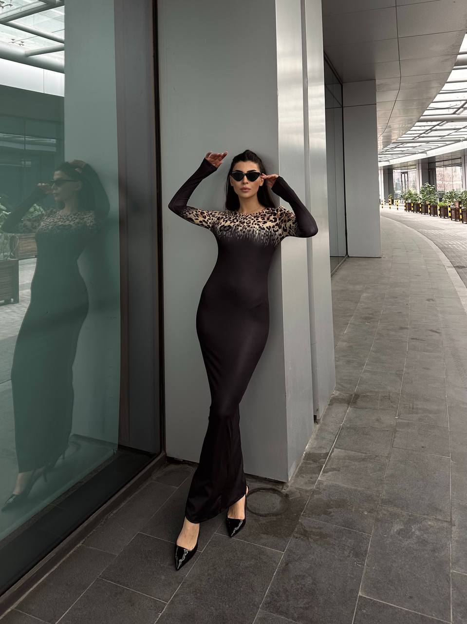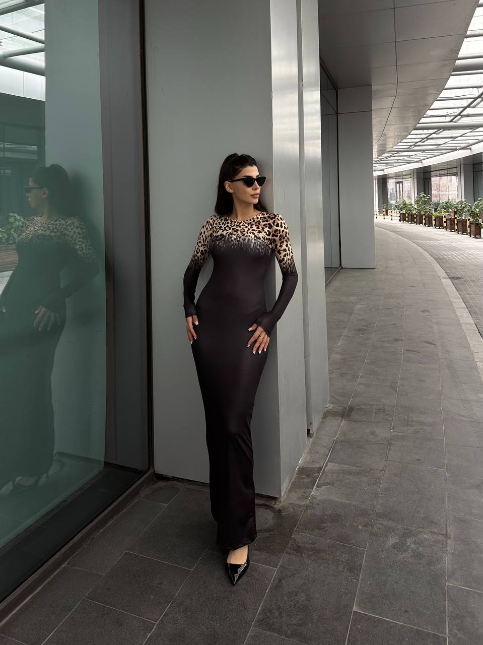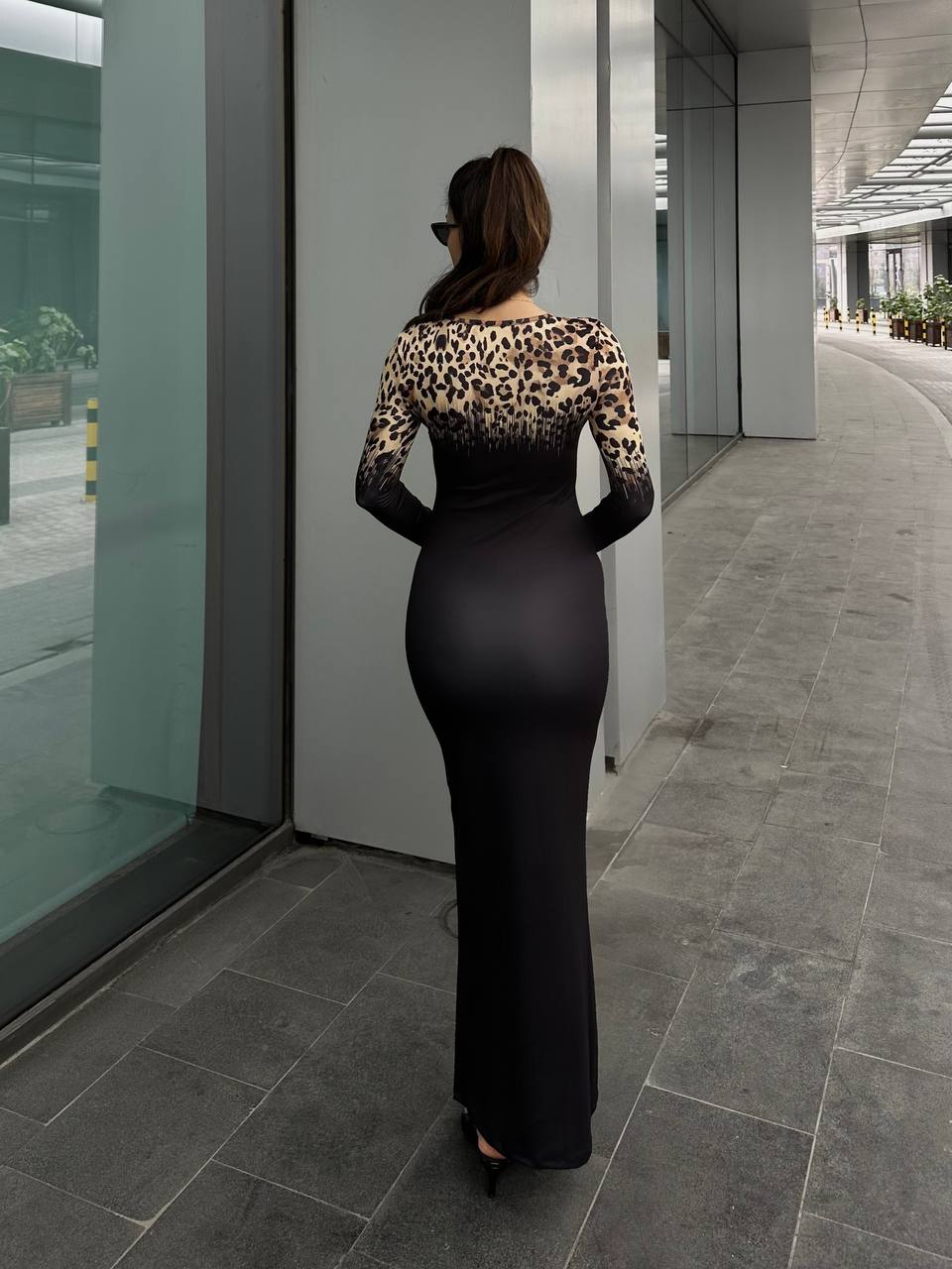 Το μακρύ εφαρμοστό μαύρο φόρεμα με λεοπάρ ώμους αποπνέει μια αύρα αέρινης κομψότητας και αισθησιασμού. Τα μακριά μανίκια προσφέρουν μια νότα μυστηρίου και ρομαντισμού, ενώ οι  λεοπάρ λεπτομέρειες προσθέτουν μια δόση κομψότητας και θηλυκότητας. Η ελαστικότητα του υλικού αναδεικνύει μια τέλεια σιλουέτα, αναδεικνύοντας τις καμπύλες σας. Ιδανικό για βραδινές εξόδους, αυτό το φόρεμα θα σας κερδίσει με την εκλεπτυσμένη του εμφάνιση και την άνετη εφαρμογή του.
