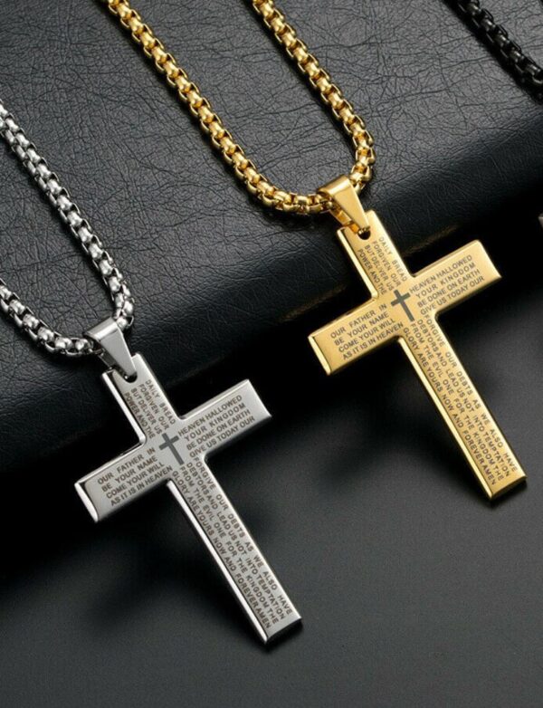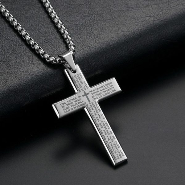 Καταπληκτικός ανδρικός σταυρός με εγχάρακτη προσευχή, κατασκευασμένος από ανοξείδωτο ατσάλι. Συνοδεύεται από ιδιαίτερη χοντρή αλυσίδα πάχους 3 χιλιοστών και μήκος 60cm. Το μοτίφ έχει διαστάσεις 3,3 cm X 5 cm.