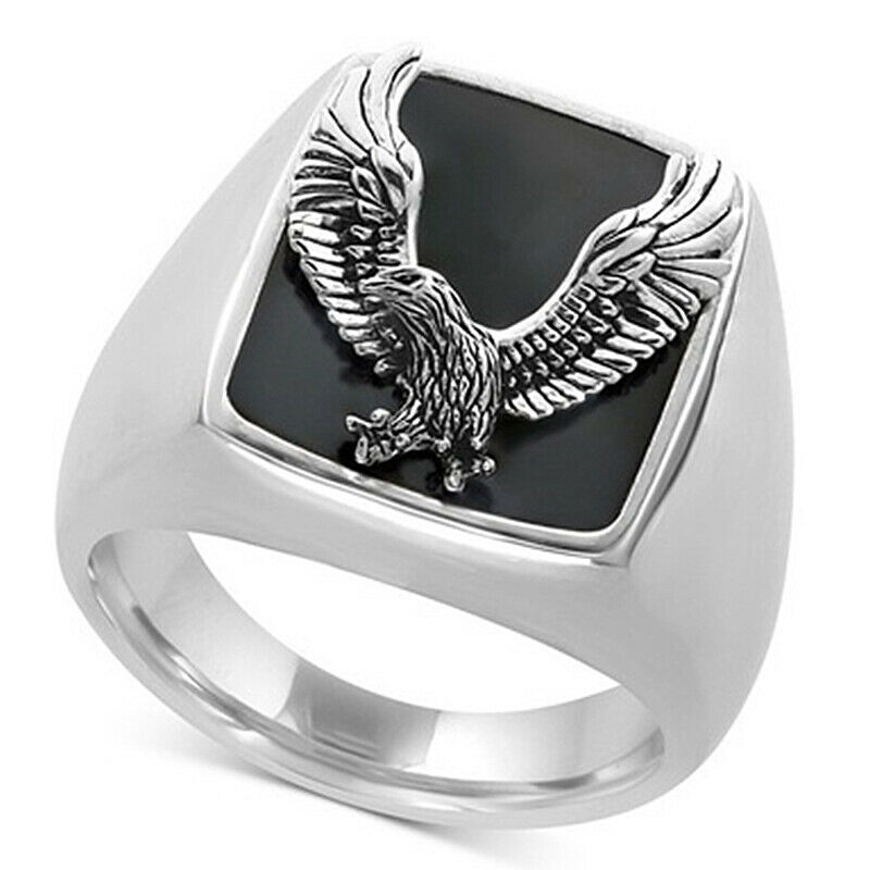 Επάργυρο 925 ανδρικό δαχτυλίδι. Μεγάλο και εντυπωσιακό. Διακοσμείτε με ανάγλυφο μοτίφ, τον πετάμενο αετό και μαύρο σμάλτο.