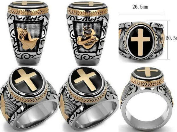 Ανδρικό δαχτυλίδι κατασκευασμένο από ατσάλι με αντικέ επεξεργασία και λεπτομέρειες κίτρινου χρυσού 14 καράτια. Μεγάλο και εντυπωσιακό (26,5mm x 20,5mm). Διακοσμείτε με ανάγλυφο μοτίφ, το αιώνιο σύμβολο του σταυρού και μαύρο σμάλτο.