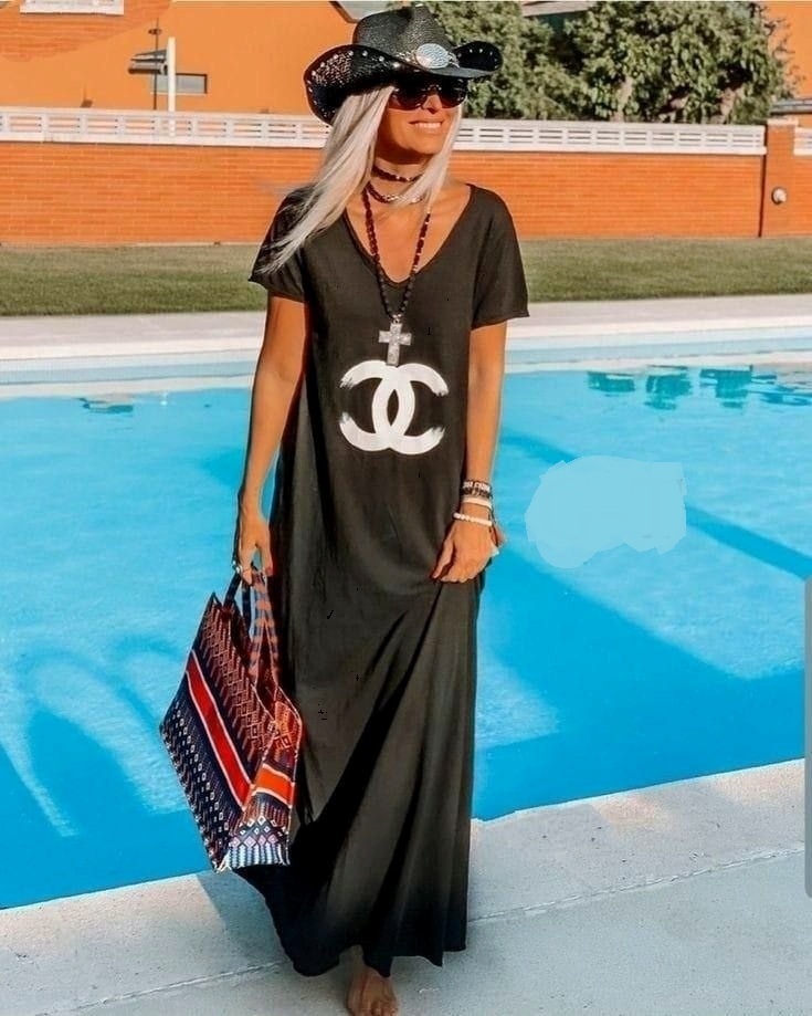Καλοκαιρινό μαύρο μακρύ φόρεμα με τύπωμα CC