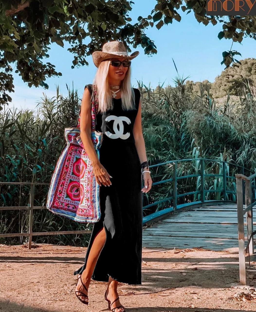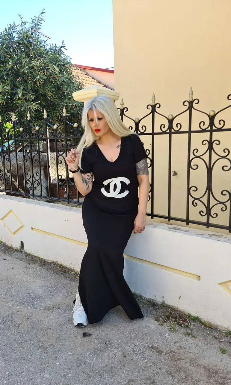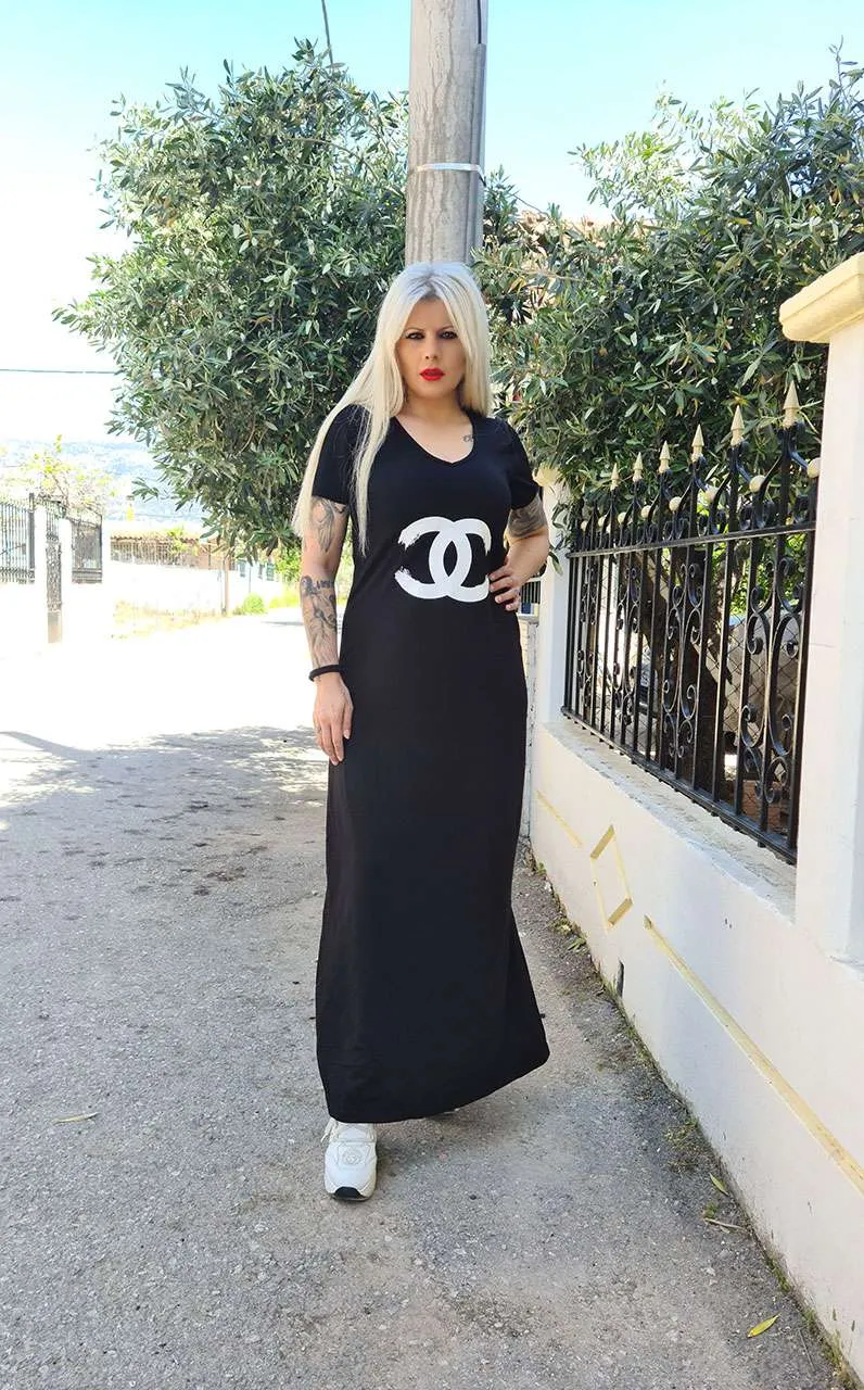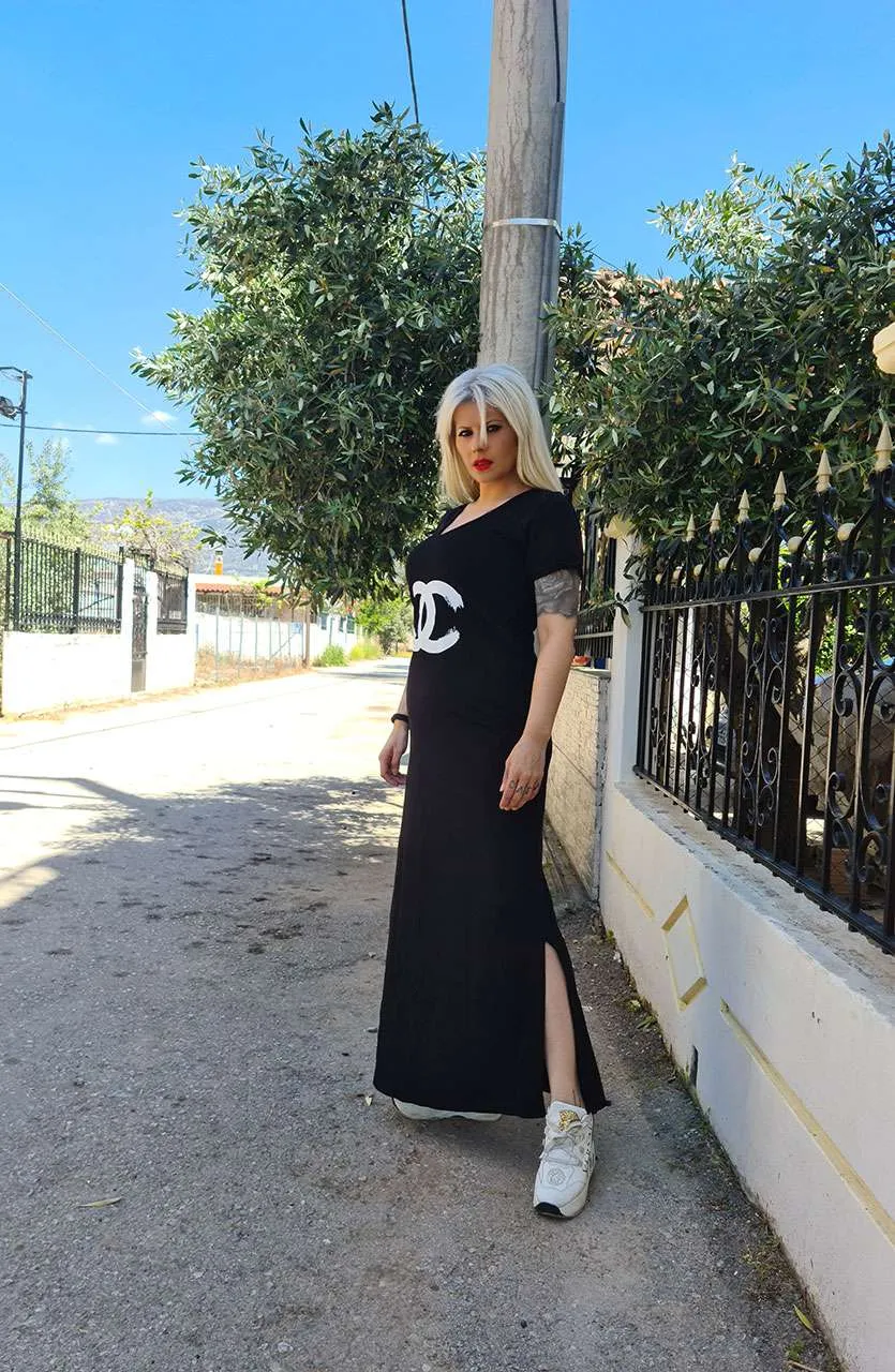 Καλοκαιρινό μαύρο maxi φόρεμα με σκίσιμο στο πλάι και με τύπωμα CC !!  Για να είστε πάντα στη μόδα! Είναι κατασκευασμένο από 80% βαμβάκι και 20% βισκόζη.