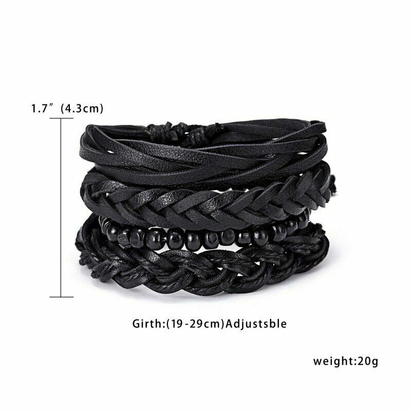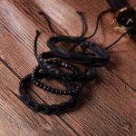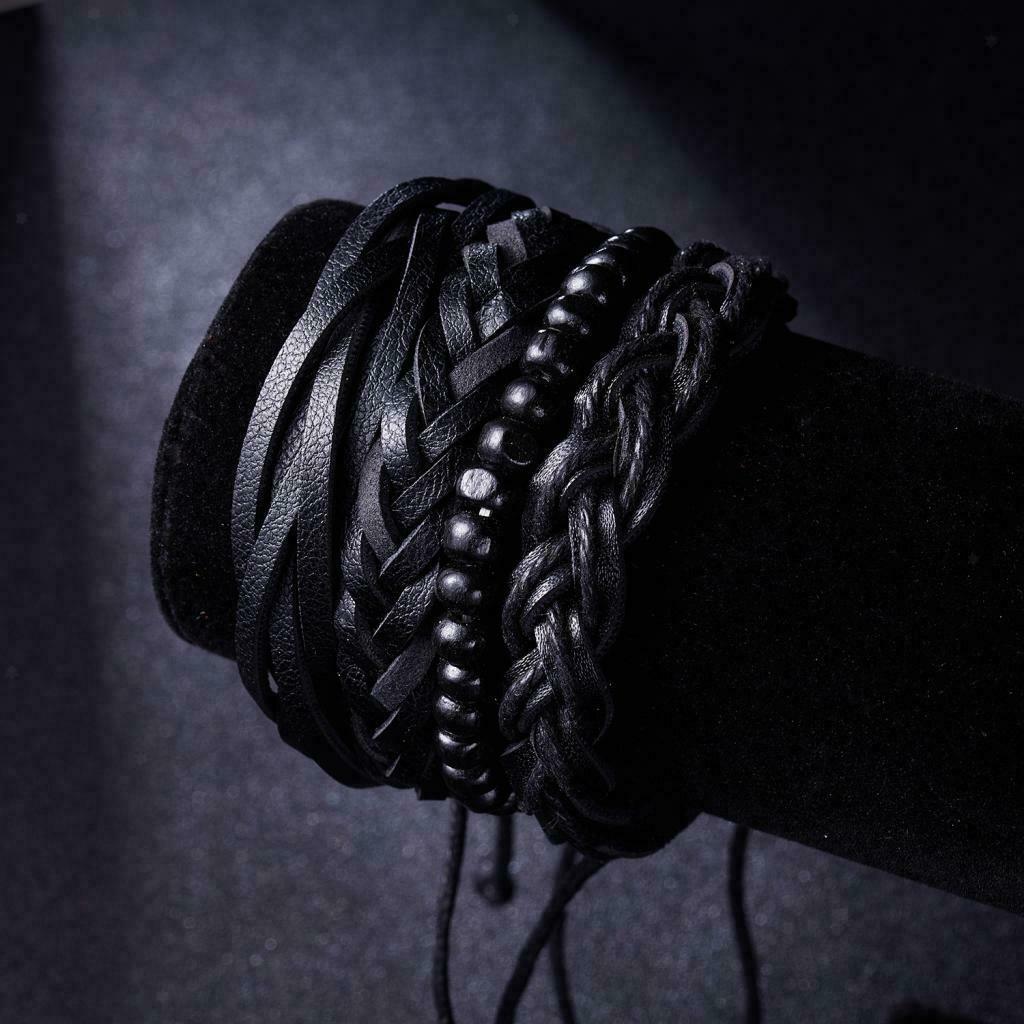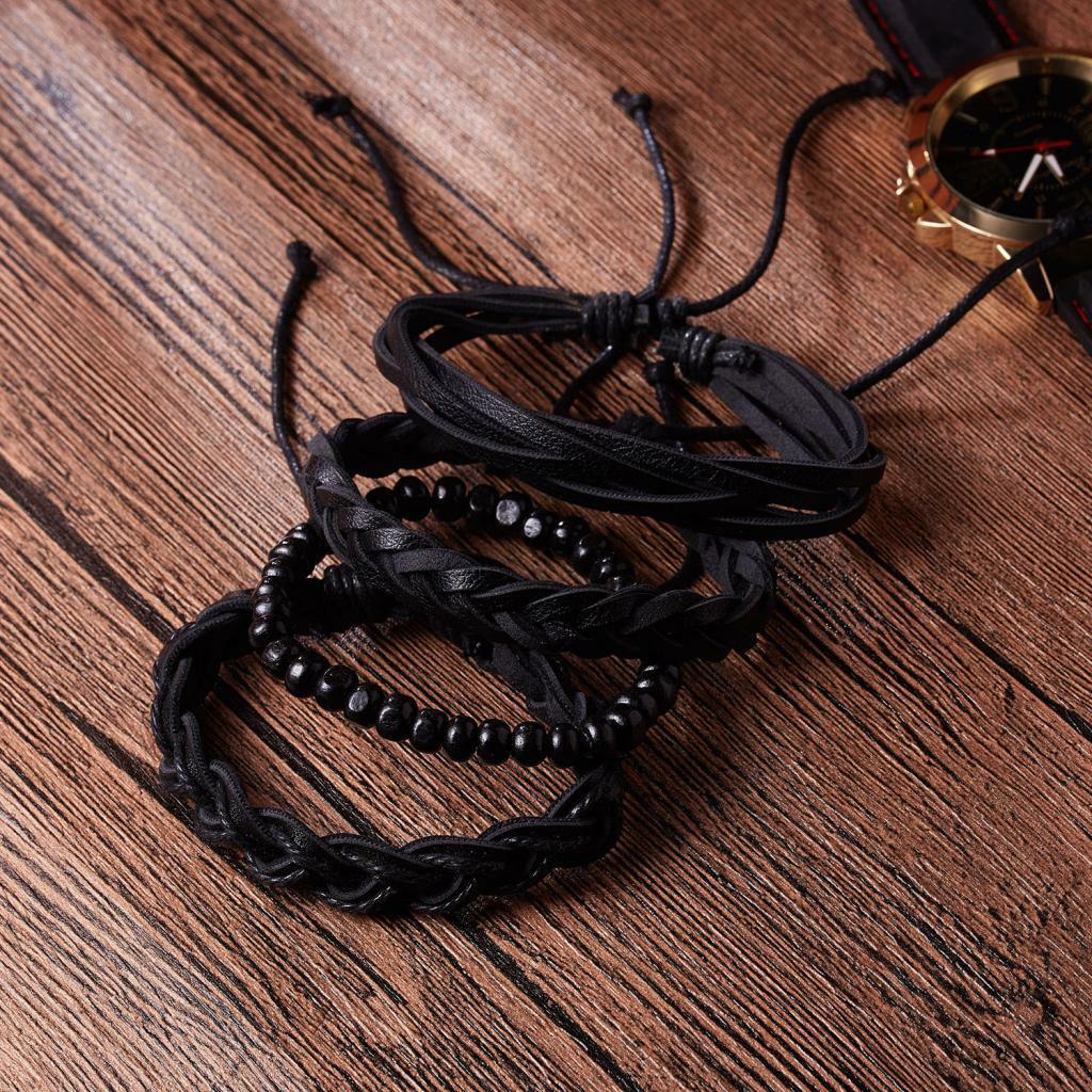 Ανδρικό Vintage βραχιόλι κατασκευασμένο από δέρμα αγελάδας και ξύλο σε μαύρο χρώμα, αποτελείται από 4 βραχιόλια μαζί. Προσαρμόζεται σε όλα τα μεγέθη. Μόνο από φυσικά υλικά.(Με δυνατότητά να τα φοράτε και χωριστά)