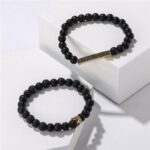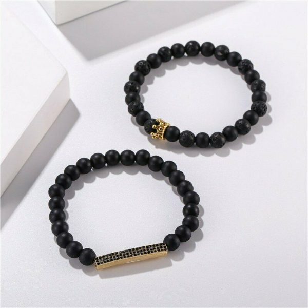 Ανδρικό, μοντέρνο σετ 2 βραχιόλια, κατασκευασμένα από 100%  φυσικές, μαύρες, ηφαιστειακές πέτρες, 9mm. Περασμένες σε διπλό ελαστικό ιμάντα. Gold μοτίφ από ανοξείδωτο ατσάλι.