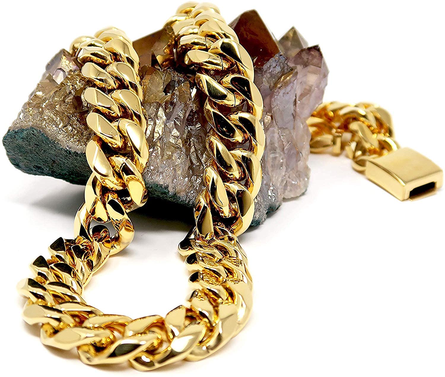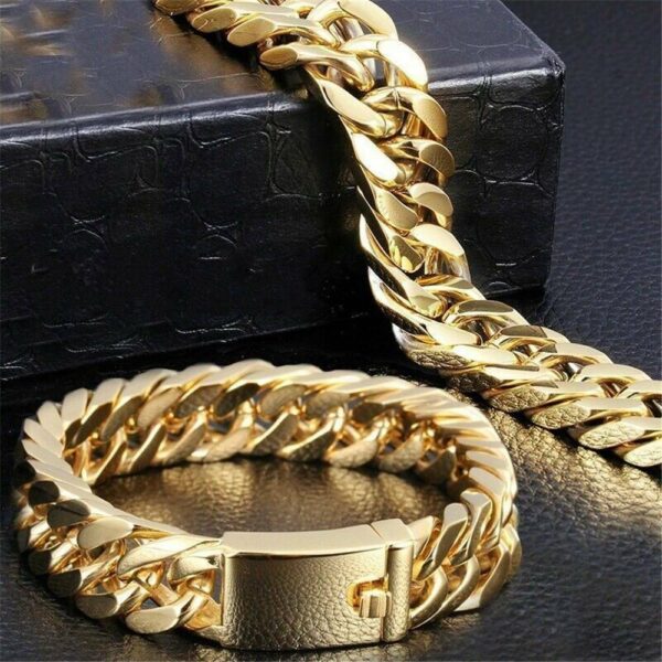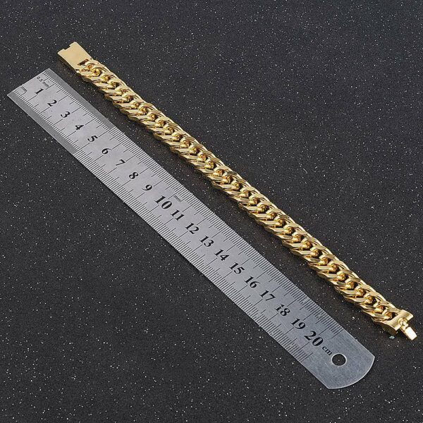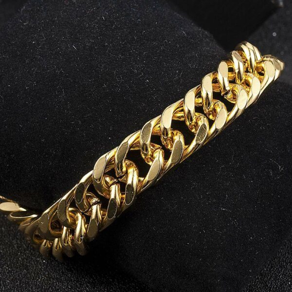 Η πλούσια επιχρυσωμένη αλυσίδα χεριού 14 καρατίων είναι κατασκευασμένη από συμπαγή ανοξείδωτο χάλυβα. Προσφέροντας μια πιο στρογγυλή και παχύτερη αλυσίδα, το στυλ αλυσίδας Miami Cuban. Πολύ Φαρδιά Πάχους 16 mm και μήκος 24 cm.Το κλασικό βραχιόλι με αλυσίδα Miami Cuban 16 χιλιοστών διαθέτει τώρα ένα νέο κούμπωμα ασφαλείας. Το βραχιόλι έχει ασφαλή και άνετη χρήση. Το βραχιόλι διατίθεται επιχρυσωμένο 14Κ.