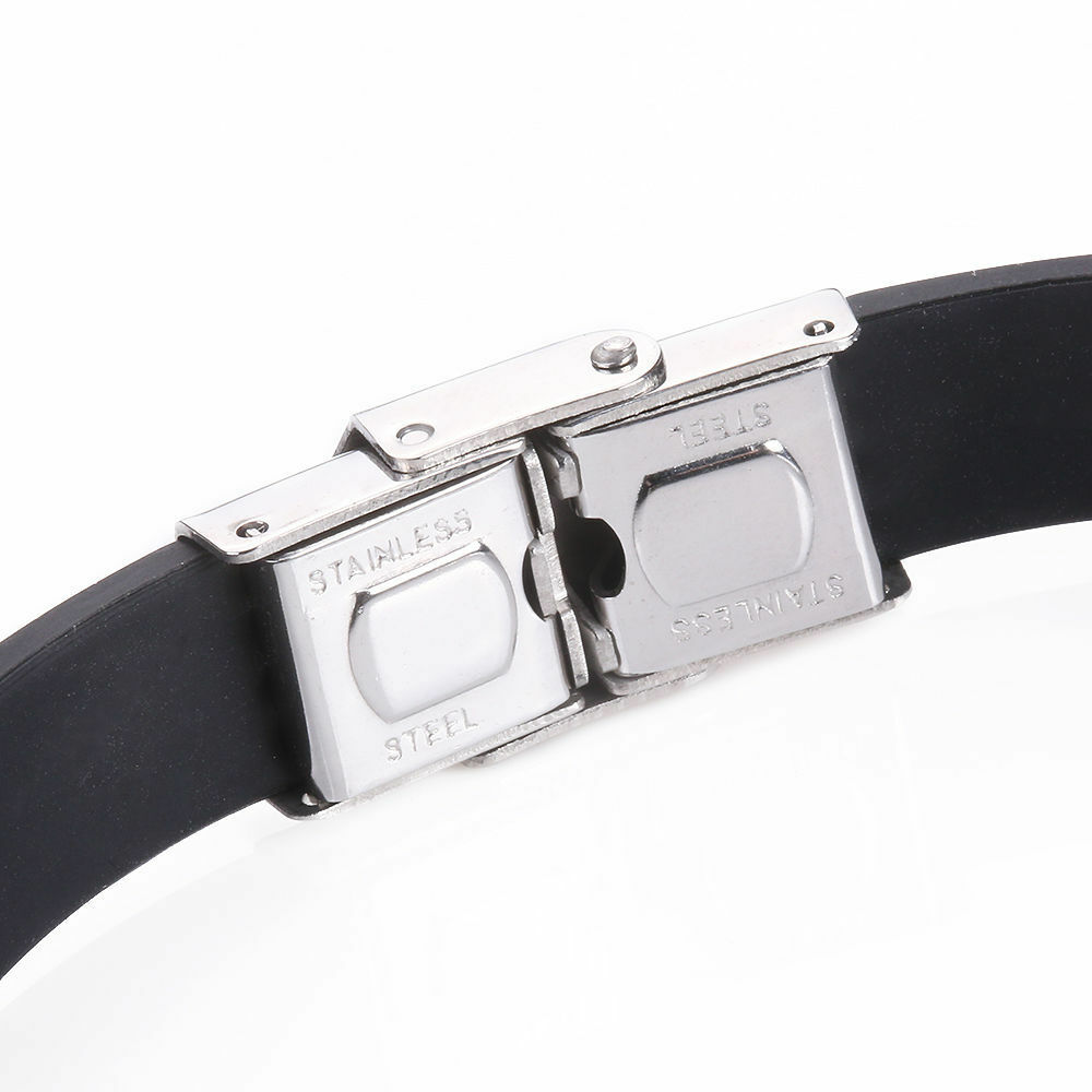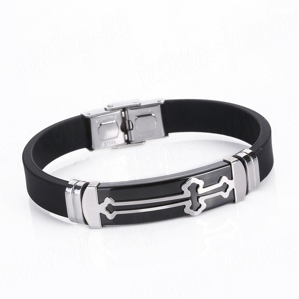 Μοντέρνο μαύρο ανδρικό βραχιόλι, με μοτίφ το αιώνιο σύμβολο του σταυρού. Kατασκευασμένο από σιλικόνη και ανοξείδωτο ατσάλι έτσι ώστε να μένει αμετάβλητο στο χρόνο. Το βραχιόλι έχει μήκος 21 εκατοστά.