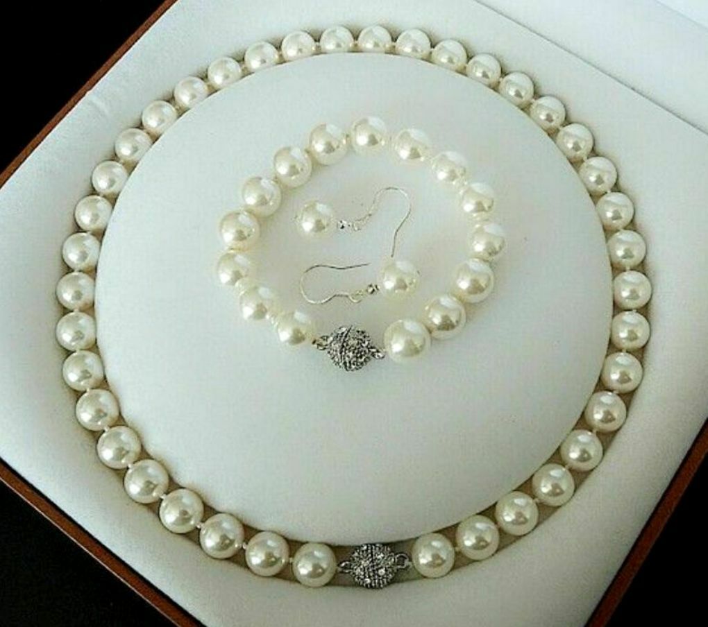 ΣΕΤ που αποτελείται από κολιέ βραχιόλι και σκουλαρίκια με genuine natural  sea Shell πέρλες ΑΑΑ+, μέγεθος 10mm. Περασμένες μία-μία χωριστά σε διπλό μεταξωτό νήμα. Μήκος κολιέ 48 εκατοστά, σε χρώμα κατάλευκο και λαμπερό λόγω της εξαιρετικής ποιότητας της πέρλας, με τα ακριβώς ίδια σκουλαρίκια του & βραχιόλι!! Τα μεταλλικά στοιχεία του είναι από ασήμι 925 με επιμετάλλωση λευκού χρυσού. Μαγνητικό κούμπωμα διακοσμημένο με λευκά ζιργκόν σε κοπή round.