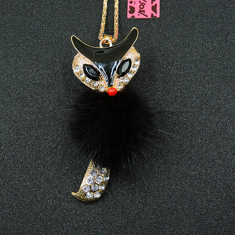 Μενταγιόν η πονηρή αλεπού με μακριά αλυσίδα, με μοτίφ μία μαύρη αλεπού με κινούμενη ουρά σε διαστάσεις 7,5 x 3 εκατοστά ,διακοσμημένη εξ ολοκλήρου με λευκά round ζιργκόν και μαύρη γούνα!