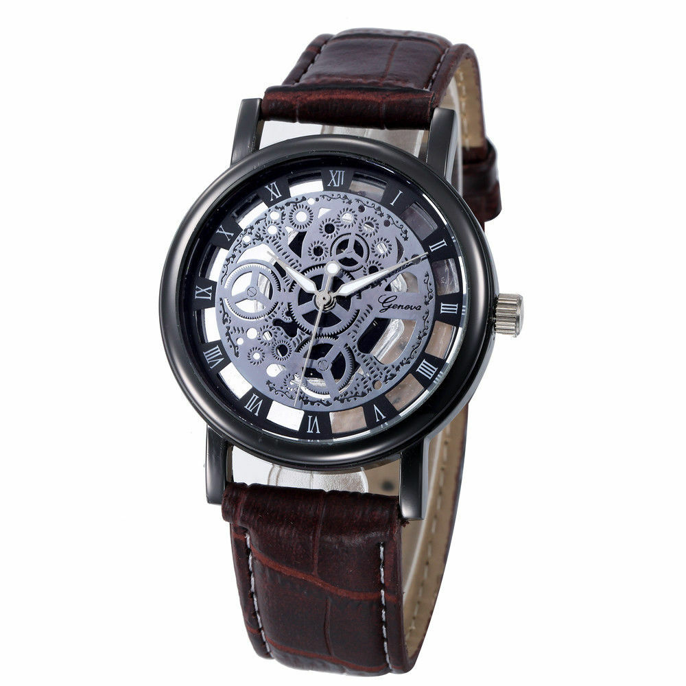 Αναλογικό, μοντέρνο, διαφανές, 4 εκ. διάμετρος καντράν, λουράκι δερματίνη σε χρώμα καφέ, όχι αδιάβροχο.