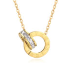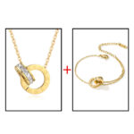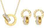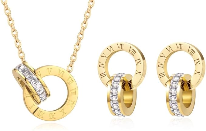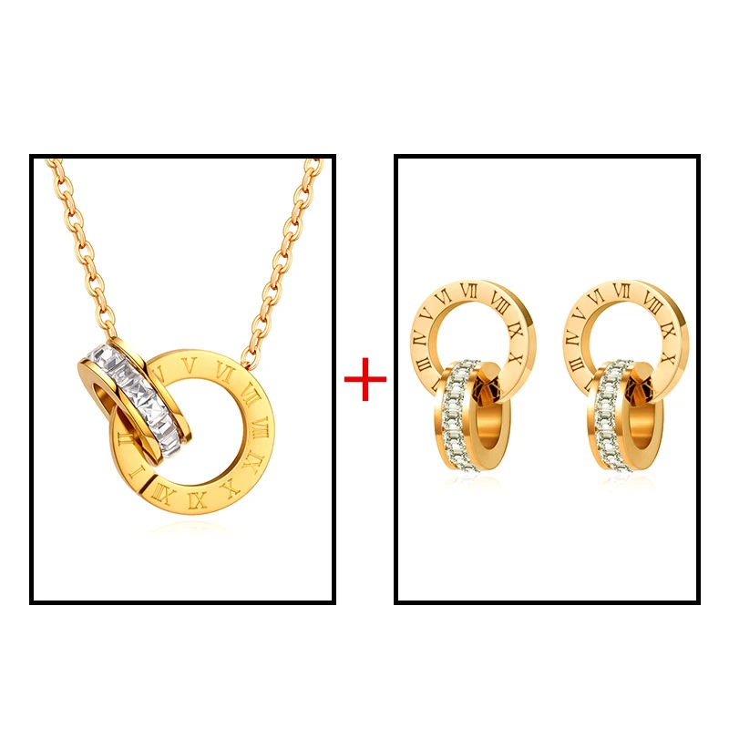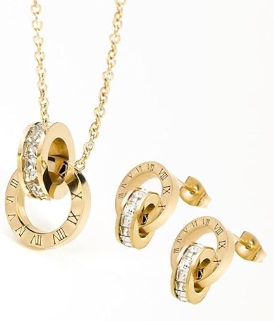 Εντυπωσιακό μοντέρνο σετ “Elegant Vogue” που αποτελείται από καρφωτά σκουλαρίκια διακοσμημένα με λευκά ζιργκόν στην περίμετρο του και κολιέ διακοσμημένο με λευκά ζιργκόν σε κοπή round. Κατασκευασμένα από επιχρυσωμένο ορείχαλκο. Μήκος κολιέ 47 εκατοστά και σκουλαρίκια 1 & 1,2 εκατοστά διάμετρο. Ενα εντυπωσιακό και ταυτόχρονα διακριτικό σετ που μπορεί να συνδυαστεί άψογα με το σύνολο της γκαρνταρόμπας σας!