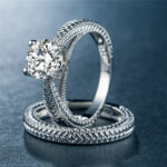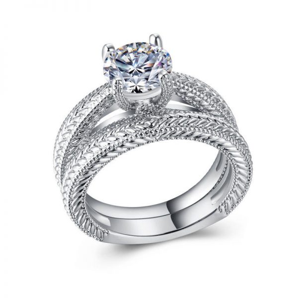 Επάργυρο 925 ΣΕΤ δαχτυλιδιών που αποτελείται από βέρα, περίτεχνα διακοσμημένη με ιδιαίτερη πλέξη και μονόπετρο δαχτυλίδι διακοσμημένο με λευκό ζαφείρι 8mm (lab-created) σε κοπή round brilliant.