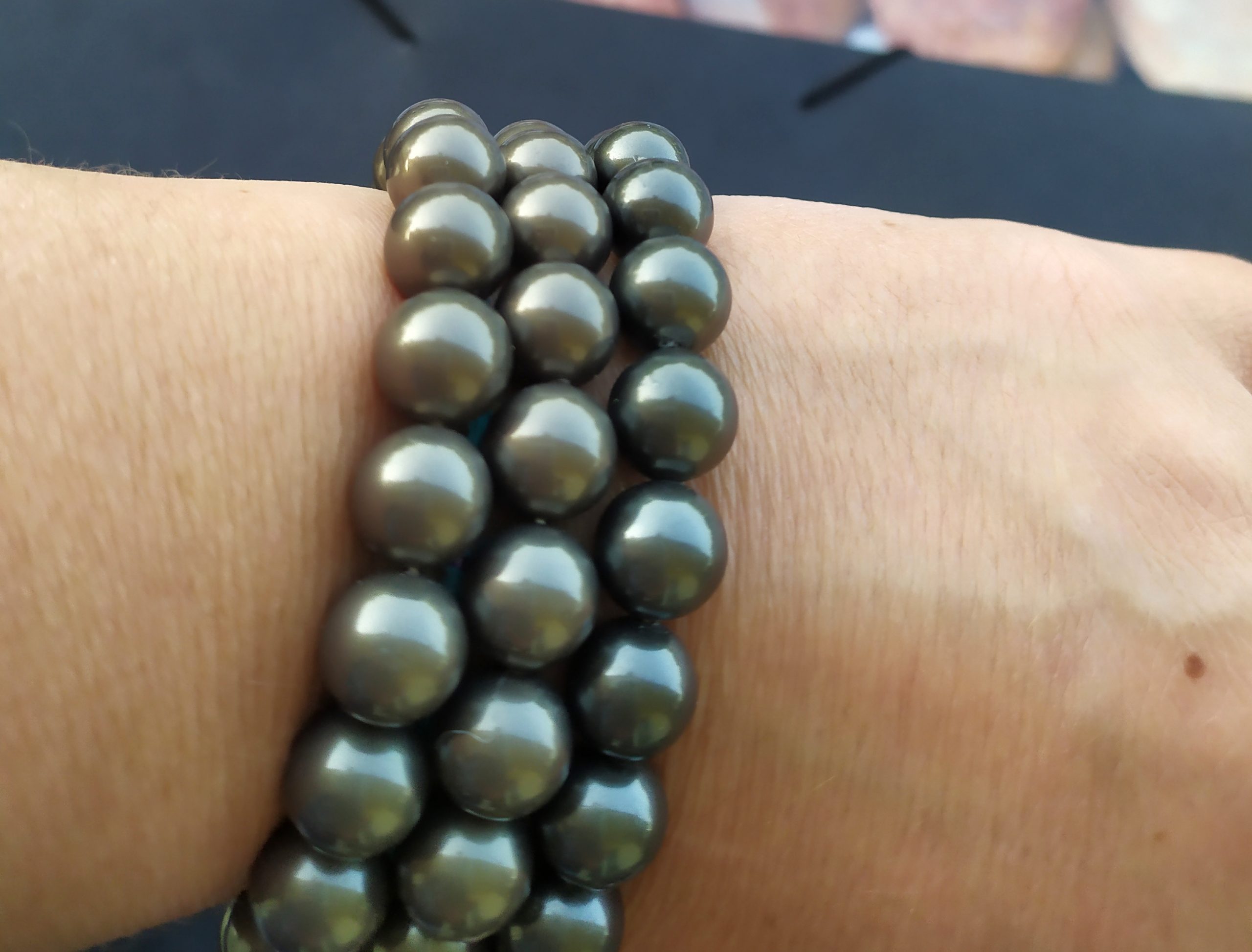 Σετ που αποτελείται από τρία βραχιόλια κατασκευασμένα από South Sea Shell πέρλες 10 χιλιοστών στο χρώμα της άμμου, περασμένα σε ελαστικό ιμάντα έτσι ώστε να προσαρμόζονται σε όλους τους καρπούς. Έχουν περίμετρο περίπου 21 εκατοστά.