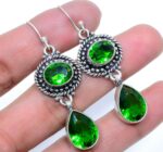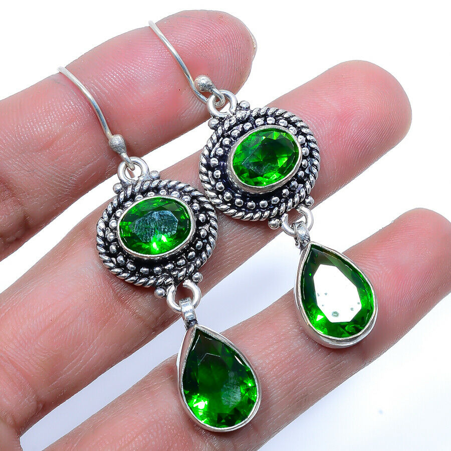 Εντυπωσιακά μεγάλα, χειροποίητα, κρεμαστά σκουλαρίκια, κατασκευασμένα από ασήμι 925 και διακοσμημένα με λαμπερές πέτρες Chrome Diopside (Lab-Created) σε κοπή oval, και pear. Τα σκουλαρίκια έχουν μήκος 5 εκατοστά.