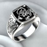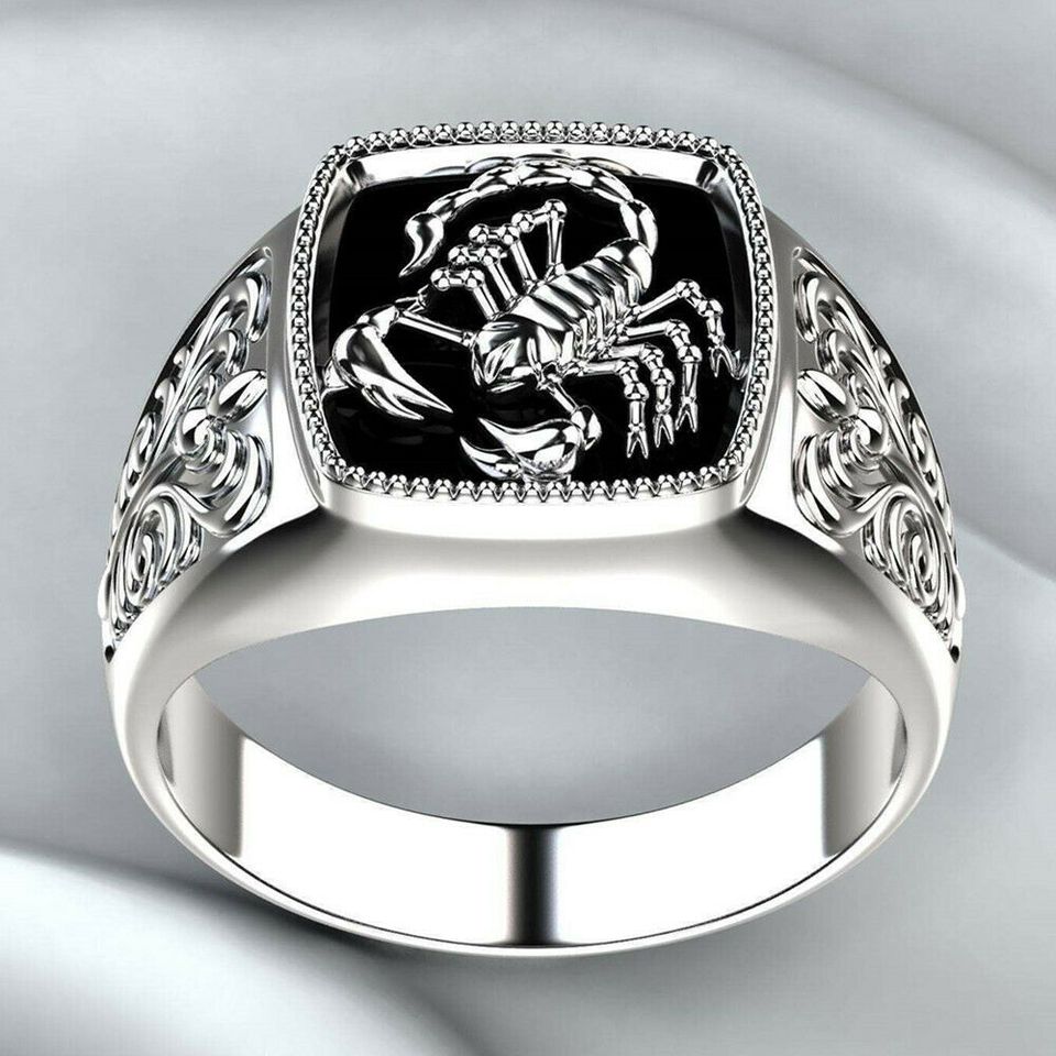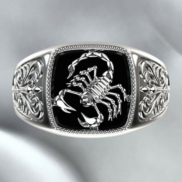 Επάργυρο 925 ανδρικό δαχτυλίδι. Μεγάλο και εντυπωσιακό. Διακοσμείτε με ανάγλυφο μοτίφ ένα σκορπιό και μαύρο σμάλτο.