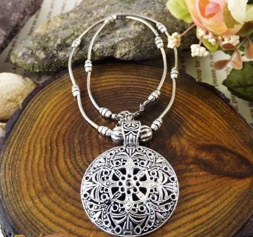 Kολιέ κατασκευασμένο από ατσάλι με επιμετάλλωση ασημί και επεξεργασία αντικέ. Με μεγάλο εντυπωσιακό στρογγυλό έθνικ μοτίφ!! Μήκος αλυσίδας 42 εκατοστών + 7 εκατοστά το αλυσιδάκι προέκτασης στο πίσω μέρος.