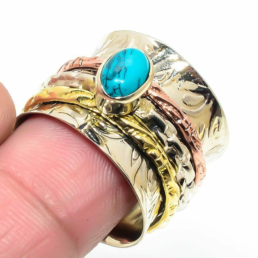 Δαχτυλίδι Spinner Rings, χειροποίητο, κατασκευασμένο από ασήμι 925, διακοσμημένο με φυσικό, ορυκτό, ημιπολύτιμο λίθο τυρκουάζ. Mε επιμετάλλωση στα τρία χρώματα του χρυσού, κίτρινο ροζ και λευκό.