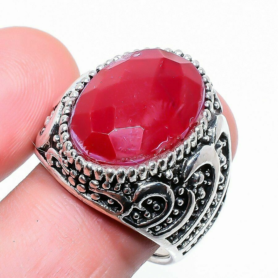 Δαχτυλίδι χειροποίητο, κατασκευασμένο από ασήμι 925 διακοσμημένο με ένα μεγάλο τεχνητό κατακόκκινο ρουμπίνι σε κοπή oval.