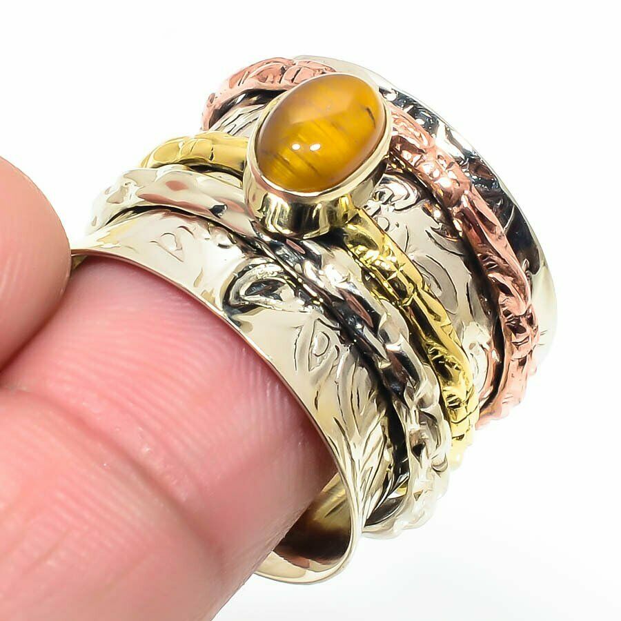 Δαχτυλίδι Spinner Rings, χειροποίητο, κατασκευασμένο από ασήμι 925 και διακοσμημένο με φυσικό, ορυκτό, ημιπολύτιμο λίθο μάτι της τίγρης (tiger eye). Διαθέτει επιμετάλλωση στα τρία χρώματα του χρυσού, κίτρινο ροζ και λευκό.