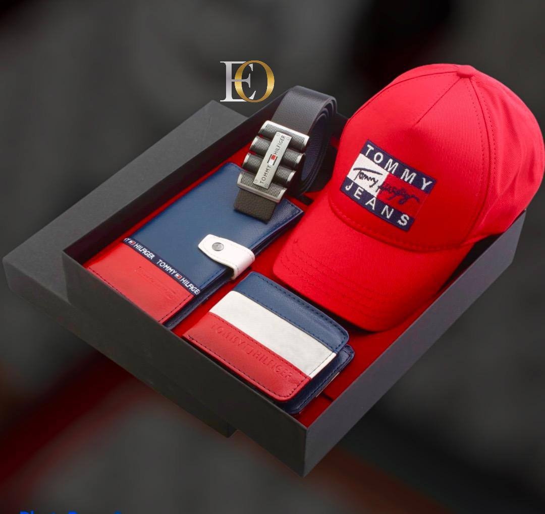 Ανδρικό ολοκληρωμένο σετ για δυναμικές εμφανίσεις. Το σετ περιλαμβάνει μεγάλο πορτοφόλι organizer καρτών, πορτοφόλι τσέπης,  ζώνη και καπέλο TOMY HILFINGER. Έρχεται σε σας σε πολυτελή κασετίνα δώρου.