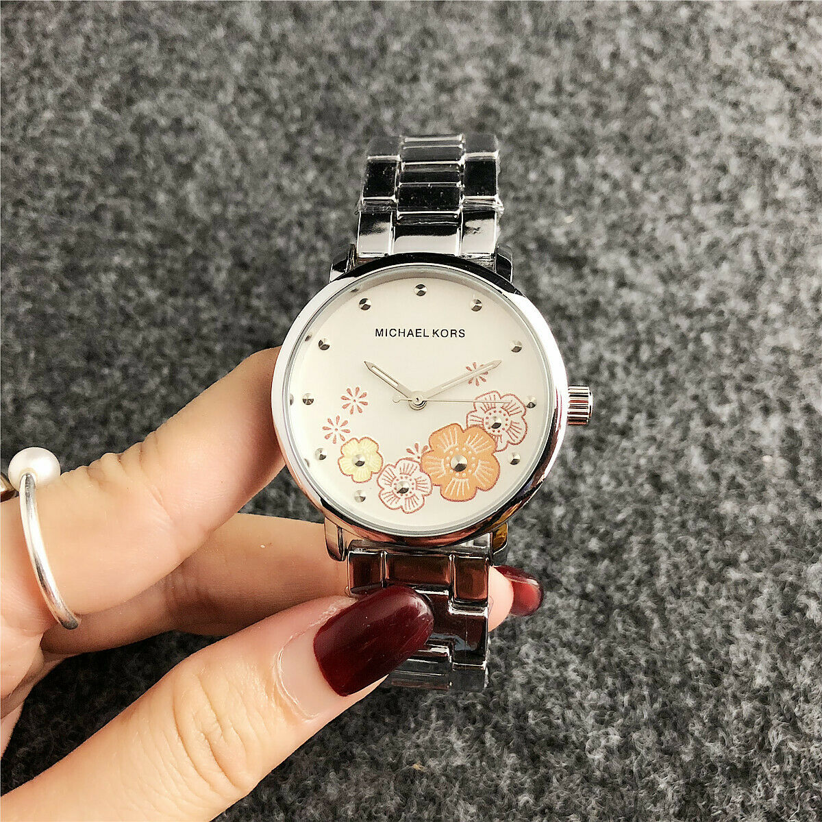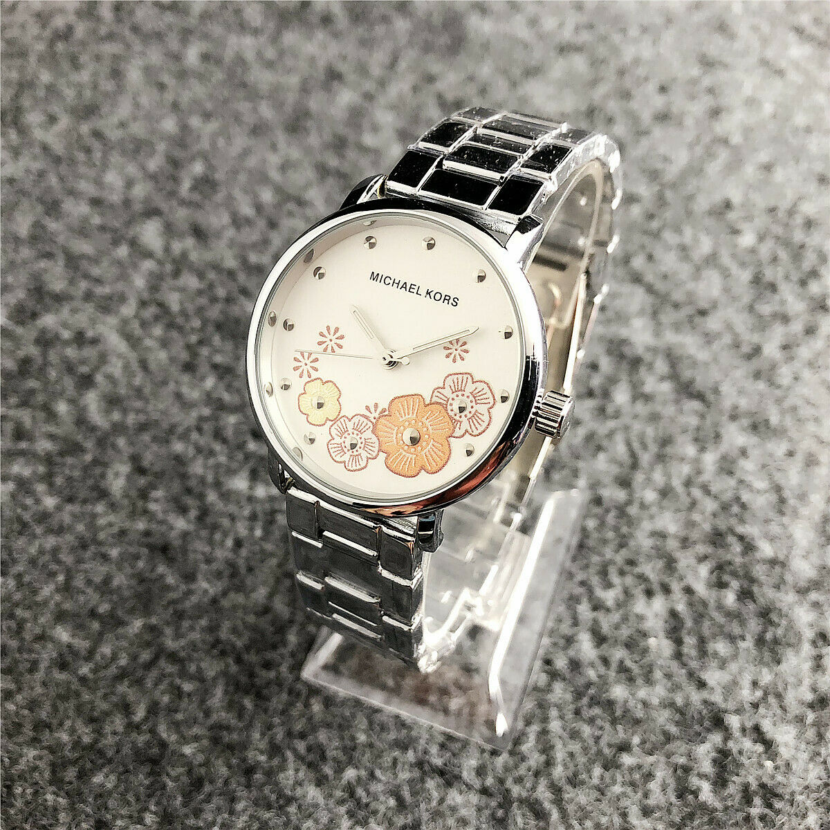 Μοναδικής ομορφιάς αναλογικό ρολόι πολυτελείας Michael Kors σε silver χρώμα! Η κάσα του διακοσμείται εσωτερικά με πολύχρωμες μαργαρίτες καθώς και με αυστραλιανά κρύσταλλα που προσδίδουν ξεχωριστή ομορφιά και φινέτσα στο ρολόι! Διάσταση καντράν 3,8 εκατοστά! Η κάσα του και το μπρασελέ του είναι από ανοξείδωτο ατσάλι!