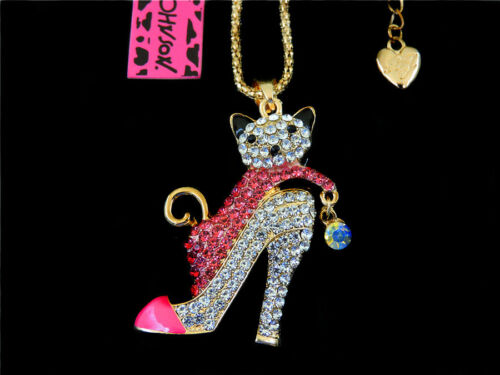 Γυναικείο μενταγιόν με μια υπέροχη ψηλοτάκουνη γόβα, διακοσμημένη με ροζ φούξια και λευκά ζαφείρια και κρυμμένη στο εσωτερικό της μία παιχνιδιάρικη γάτα! Κατασκευασμένο από ασήμι και χαλκό. Συνοδεύεται από επίχρυση αλυσίδα 70 εκατοστών. Φιλοτεχνημένη από τη γνωστή σχεδιάστρια κοσμημάτων Βetsey Johnson.