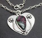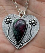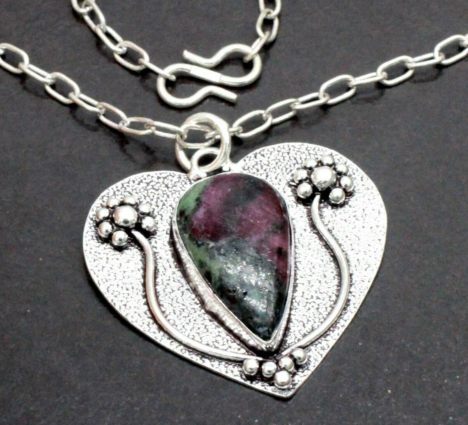 Xειροποίητο, ινδικό μενταγιόν κατασκευασμένο από ασήμι 925. Διακοσμημένο με 100% ορυκτό, ημιπολύτιμο λίθο Ρουμπίνι Ζωϊσίτη (Ruby In Zoisite) σε κοπή oval ματ φινίρισμα. Mήκος αλυσίδας 45cm.